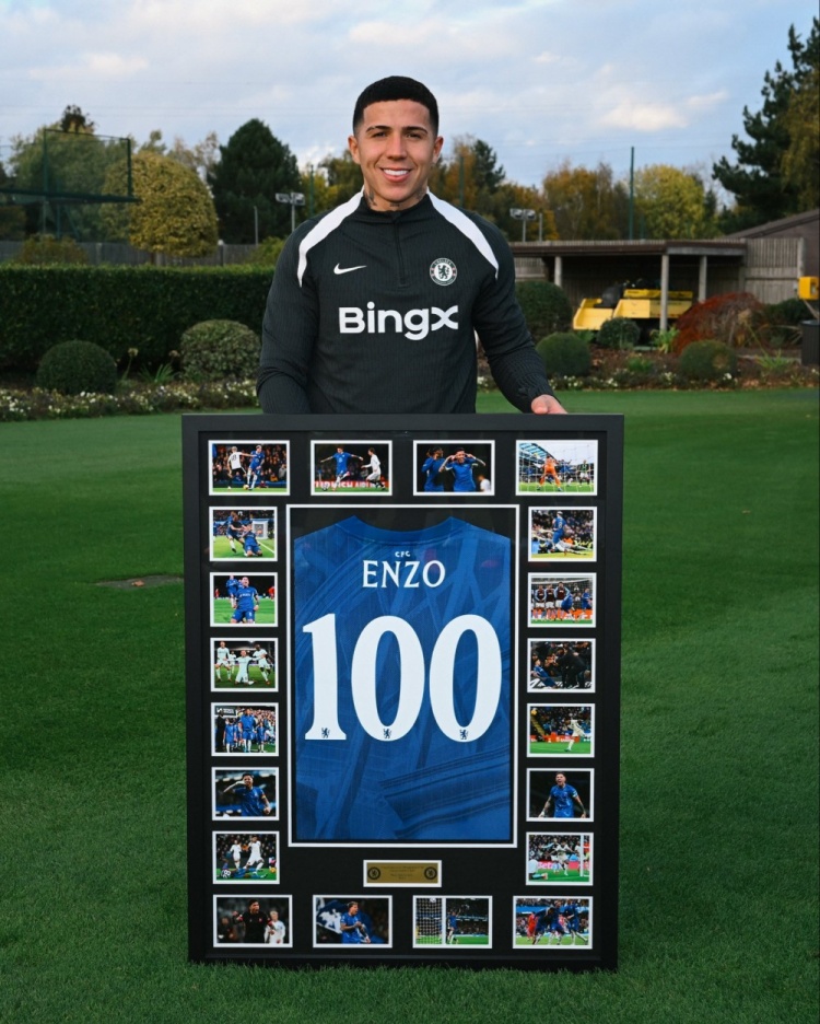 足球比分网10月29日讯 切尔西为队内五名达成百次出场成就的球员颁发了纪念球衣,同时也有这些球员代表切尔西征战的赛场照片。 五名球员分别是帕尔默、恩佐、库库雷利亚、凯塞多、查洛巴。 帕尔默代表切尔西出战101场贡献45球29助攻,恩佐127场20球24助攻,库库雷利亚125场8球11助攻,凯塞多110场7球10助攻,查洛巴116场7球3助攻。