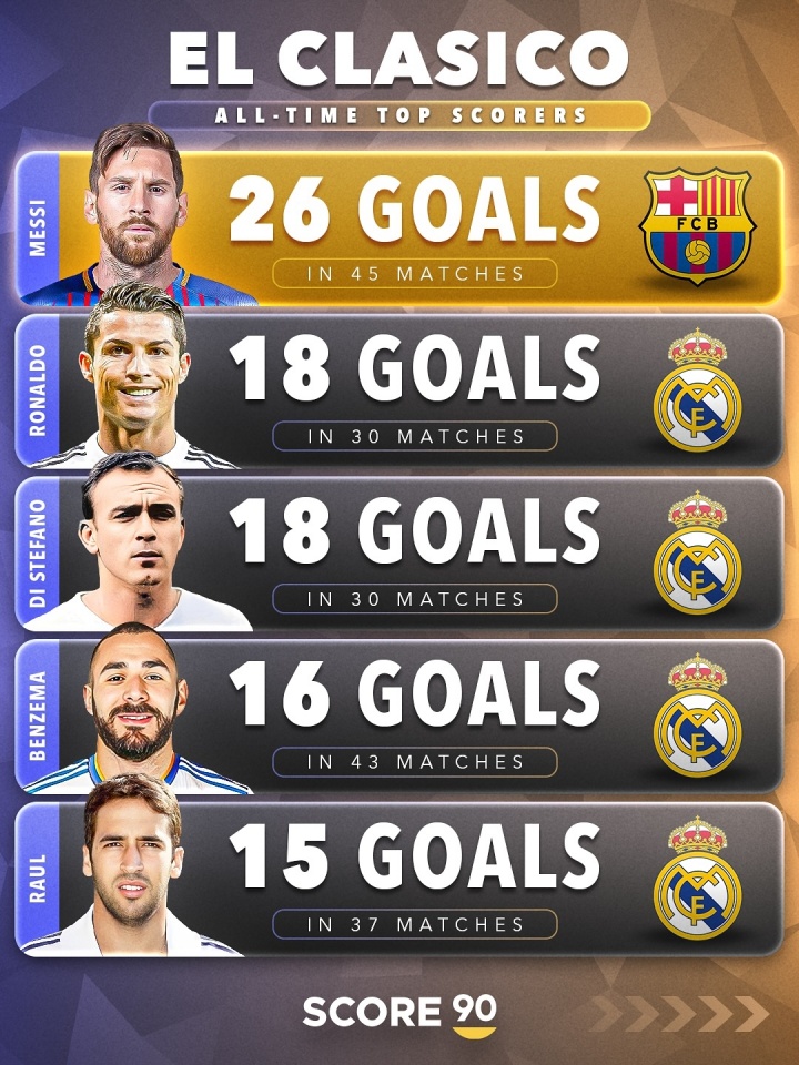 梅西26球领跑国家德比历史射手榜 小熊6球领跑国