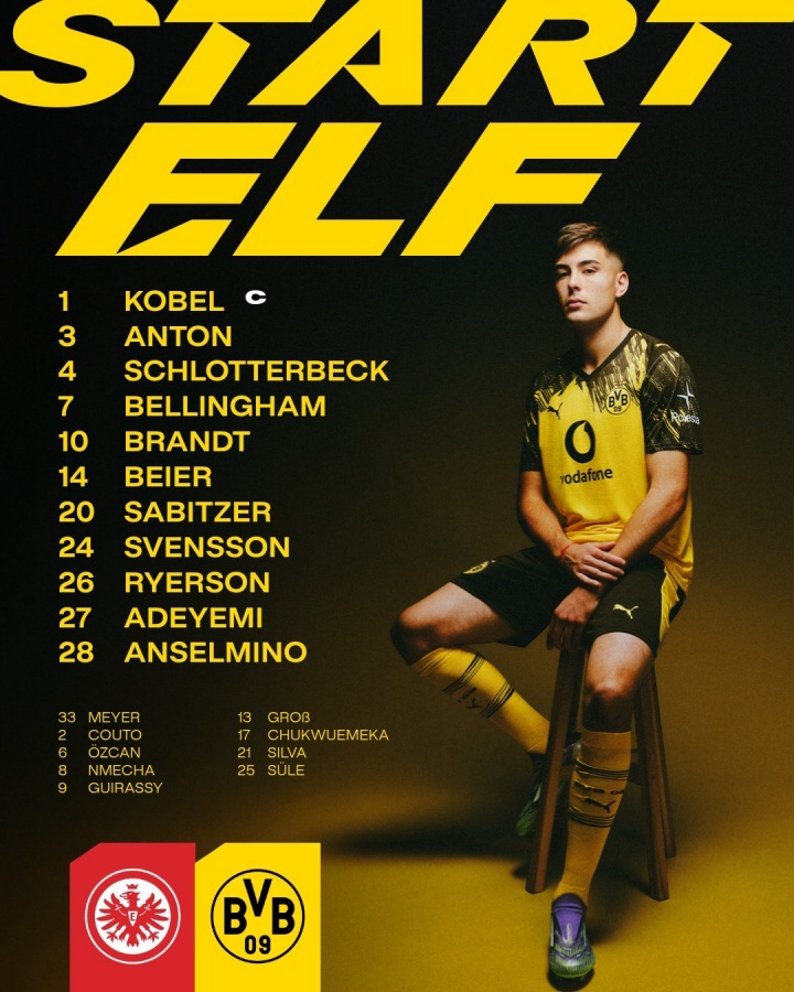 足球比分网10月29日讯 北京时间今天1点半,德国杯第二轮法兰克福对阵多特蒙德,此役双方首发已经公布。 法兰克福首发:23-泽特尔、3-泰特、4-科赫、7-克瑙夫、8-沙伊比、9-伯卡特、13-拉斯穆斯-克里斯滕森、16-雨果-拉尔森、20-堂安律、21-纳撒尼尔-布朗、27-格策 法兰克福替补:40-考昂-桑托斯、5-阿曼达、15-斯希里、17-瓦希、18-达胡德、19-巴霍亚、30-巴舒亚伊、34-纳姆迪-科林斯、42-乌尊 多特蒙德首发:1-科贝尔、3-安东、4-施洛特贝克、7-乔布-贝林厄姆、10-布兰特、14-拜尔、20-萨比策、24-斯文松、26-莱尔森、27-阿德耶米、28-安塞尔米诺 多特蒙德替补:33-亚历山大-迈尔、2-扬-库托、6-厄兹詹、8-菲利克斯-恩梅查、9-吉拉西、13-格罗斯、17-丘库埃梅卡、21-法比奥-席尔瓦、25-聚勒