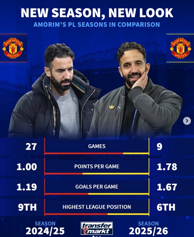 提升!阿莫林本赛季英超场均1.78分+1.67球,上赛