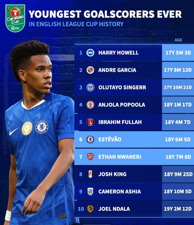 18岁!埃斯特旺和恩瓦内里分列联赛杯历史最年轻