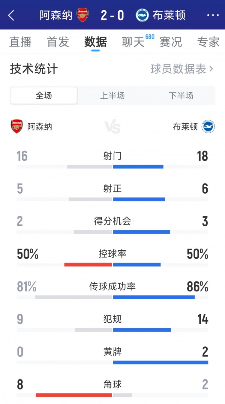 阿森纳2-0布莱顿全场数据:射门16-18,射正5-6,得