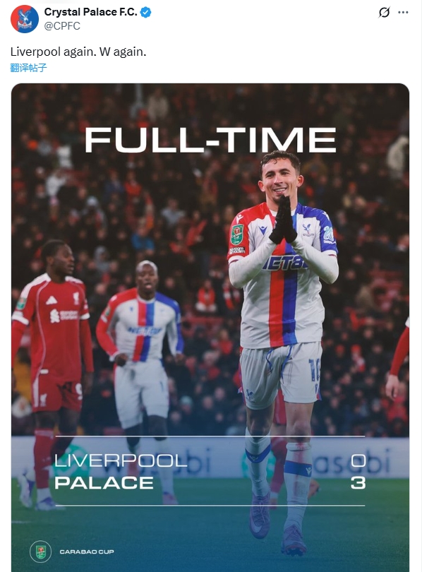 扎心了!水晶宫社媒:又是利物浦,又是一场胜 时间: 2025-10-30 来源: 网络 作者: admin 上一篇:詹俊:利物浦“二队”惨遭羞辱 斯洛特保联赛结 下一篇:罕见!在安菲尔德的国内杯赛0-3输球,是利物浦