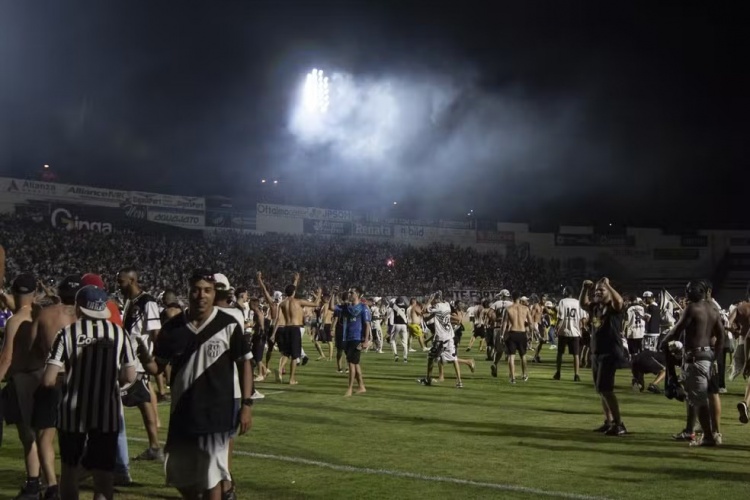 足球比分网10月29日讯 据巴西环球体育报道,10月26日,巴西丙级联赛庞特普雷塔以2-0战胜隆德里纳拿到联赛冠军,尽管这是前者125年历史上首次夺得全国冠军,但由于安全原因,传统的球场内举杯庆祝并未能实现。 根据官方安排,本应由巴西足协主席萨米尔-夏德在球场上直接向冠军队伍颁发奖杯和奖牌。然而,比赛结束哨声刚一响起,球迷便蜂拥而入,导致搭建颁奖台变得不可行。超过14000名庞特普雷塔球迷到场观赛,在比赛最后几分钟一些场外的观众也设法进入了球场内。尽管现场广播系统不断呼吁球迷不要进入场地,但大批人群还是冲入场内拥抱球员和技术团队成员。