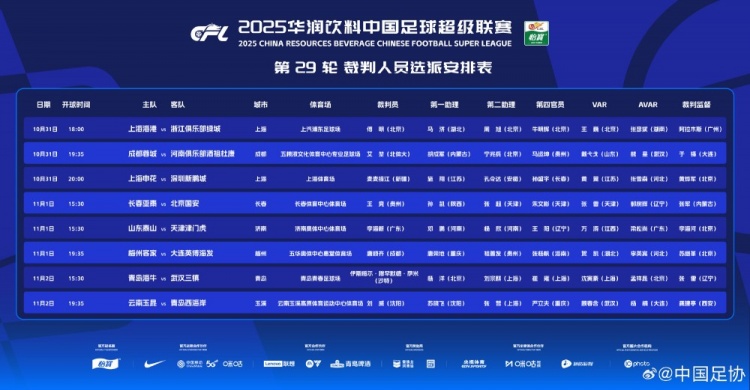 中超第29轮裁判:傅明执法海港vs浙江 沙特裁判执