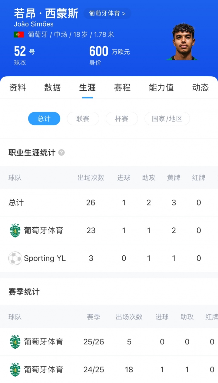 足球比分网10月31日讯 据罗马体育报报道,曼联和曼城正密切关注葡萄牙体育的18岁中场小将若昂-西蒙斯。 消息称,曼联和曼城正密切关注葡体的小将西蒙斯,双方的争夺可能将在冬窗进入白热化阶段,葡体则希望能将其留至明夏。 若昂-西蒙斯出生于波尔蒂芒,身高1.78米,体重71公斤,司职中场,是一名组织核心。作为一名左脚将,他没有防守型中场的身体素质,也没有进攻型中场的灵光乍现,但他对比赛的解读能力极强。 他的优势在于敏捷的思维。在中场混乱的局面中,他似乎总能多出一秒钟来做出决定。也总能做出正确的选择,懂得何时推进,何时放慢节奏,何时冒险,何时掌控比赛。 他的技术干净利落,简洁至上,从不炫技。他非常欣赏布斯克茨、莫德里奇和克罗斯等伟大的组织核心,并将他们视为榜样。 若昂-西蒙斯现身价600万欧,上赛季他为葡体一线队出场18次,贡献1球1助,他与葡体的合同在2030年到期,解约金8000万欧。