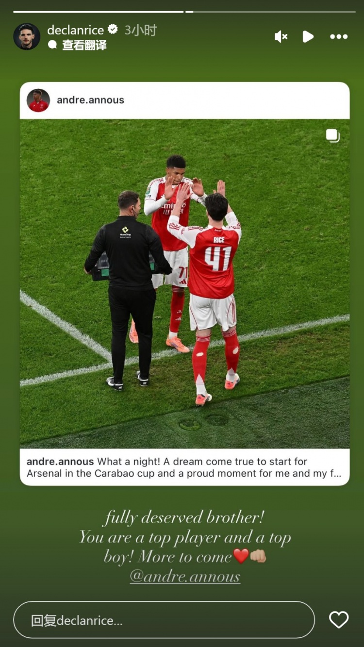 足球比分网10月31日讯 联赛杯第四轮比赛,17岁前锋安努斯为阿森纳首发出战,上演枪手一线队首秀,最终阿森纳2-0击败布莱顿。 阿森纳中场赖斯社媒转发与安努斯的合照,鼓励这位小将,配文:“这(首秀)是你应得的,兄弟!你是顶尖的球员,也是个出色的小伙子!未来会有更多出场。” |