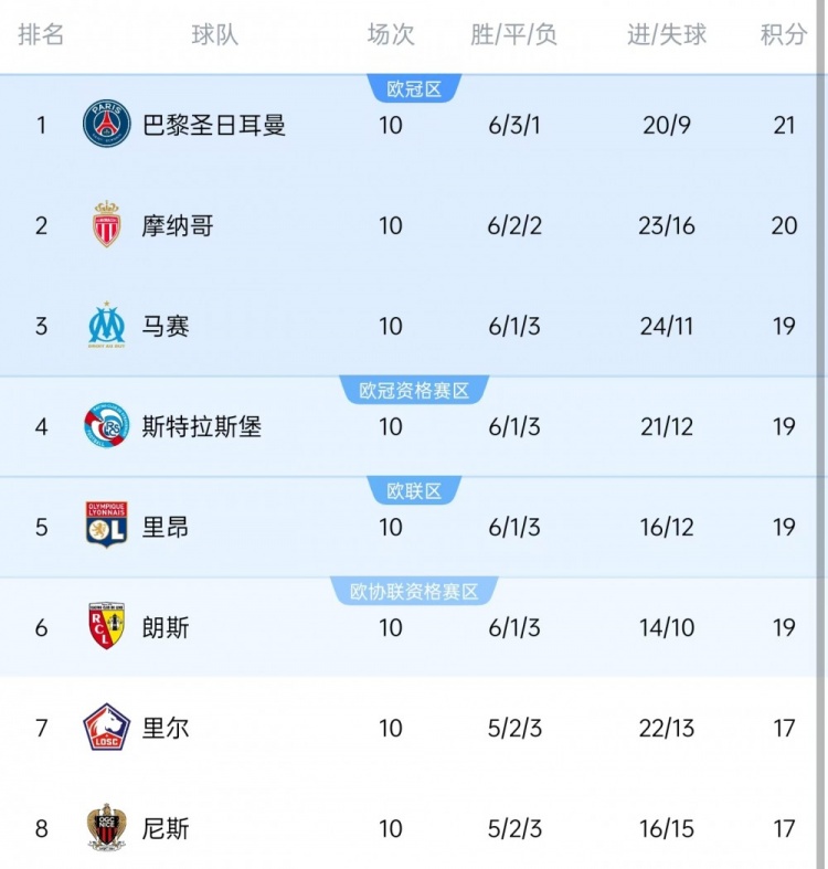 本赛季法甲10轮过后前6名球队仅相差2分,10-11赛
