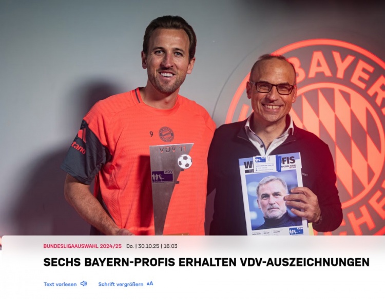足球比分网10月30日讯 拜仁俱乐部官方宣布,凯恩等6名球员领取了上赛季德国球员工会评选的最佳阵容奖杯。 在2024/25赛季职业足球运动员协会(VDV,即球员工会)最佳阵容评选中,拜仁慕尼黑实现垄断性入选——如今获奖者们终于领取了属于他们的奖杯。本周一,VDV总经理乌尔夫-巴兰诺夫斯基将奖项授予拜仁阵中的六名球员,他们于五月成功入选这家球员工会的赛季最佳阵容。 在这项传统评选中,德甲、德乙、德丙、地区联赛的所有球员以及VDV其他会员均拥有投票权。上赛季多位拜仁球员在各自位置的表现尤其令人信服:达约特-于帕梅卡诺(28.3%)、约书亚-基米希(69.1%)、贾马尔-穆西亚拉(59.7%)、哈里-凯恩(77.5%)和迈克尔-奥利塞(43.5%)。同样入选的若纳坦-塔(54.5%)虽在今夏加盟拜仁,但此次获奖是基于其在勒沃库森时期的表现。 完整最佳阵容还包括:格兰尼特-扎卡(勒沃库森,已转会桑德兰,28.3%)、纳迪姆-阿米里(美因茨,36.1%)、弗洛里安-维尔茨(勒沃库森,已转会利物浦,84.8%)、芬恩-达门(奥格斯堡,28.3%)和尼科-施洛特贝克(多特蒙德,45.0%)。 凯恩、孔帕尼等拜仁成员斩获佳绩 在VDV赛季最佳球员评选中,两位拜仁球员跻身三甲。哈里-凯恩(20.0%)与迈克尔-奥利塞(17.0%)仅逊于卫冕冠军弗洛里安-维尔茨(29.1%)。 年度最佳新秀评选亦呈现相似格局,迈克尔-奥利塞(13.8%)与拜仁新援汤姆-比绍夫(9.0%)紧随冠军尼克-沃尔特马德(37.1%)之后。 在最佳教练的评选中,拜仁冠军教头文森特-孔帕尼(22.2%)仅次于美因茨主帅博-亨里克森(25.7%),位列次席。 关于VDV 德国职业足球员协会(VDV)是在德国职业足球运动员的权益代表组织。该机构为其1400余名成员提供职业服务,涵盖劳动法、医疗健康、运动心理学及媒体培训等领域。VDV由职业球员于1987年创立。 |
