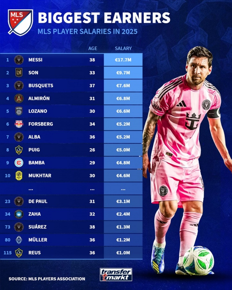 德转列美职联薪资:梅西1770万欧断层居首,孙兴