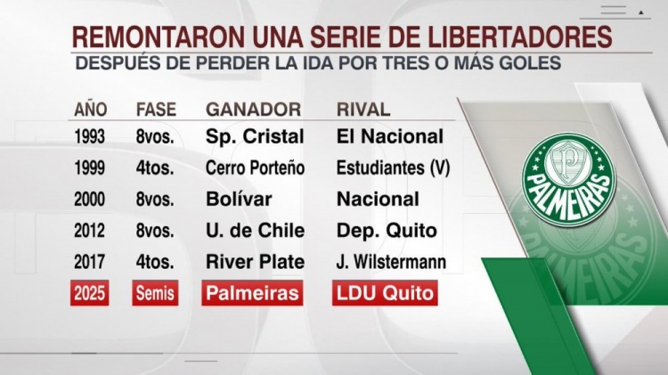 足球比分网10月31日讯 南美解放者杯半决赛次回合比赛,帕尔梅拉斯主场4-0击败基多体育大学,两回合总比分4-3逆转晋级决赛。 据ESPN统计,首回合净负三球或更多,次回合逆转晋级,南美解放者杯历史上第6次出现这样的情况,上一次是2017年河床在1/4决赛中逆转乔治维尔斯特尔曼。 |