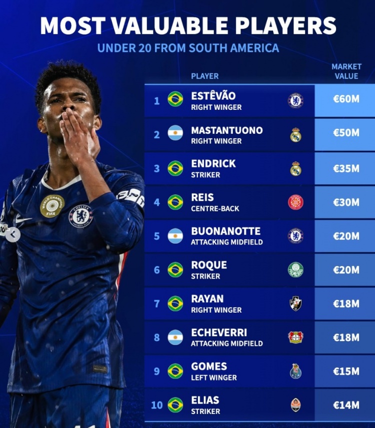 南美U20身价榜:埃斯特旺6千万,恩德里克、罗克