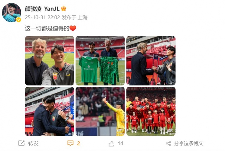 足球比分网10月31日讯 中超联赛第29轮,上海海港主场3-0击败浙江队,末轮只需战平大连英博就能夺冠。 赛后,海港门将颜骏凌晒出了与偶像范德萨的合照,并写道:这一切都是值得的。