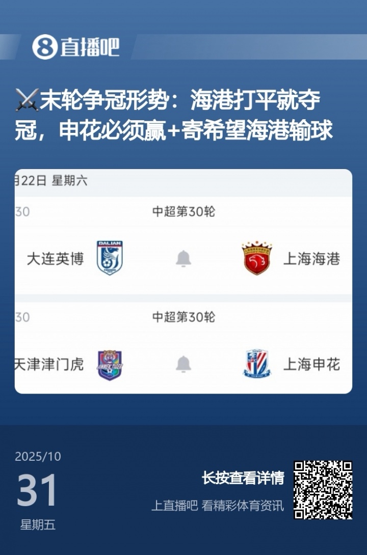 本赛季海港领先申花2分,末轮只需要打平就夺冠。 末轮海港客战大连,申花客战津门虎。