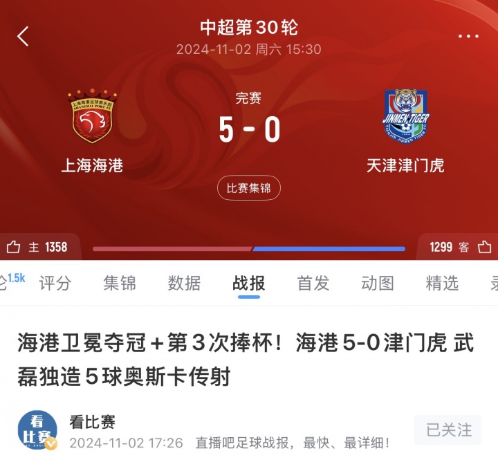 足球比分网10月31日讯 上赛季中超第29轮结束,海港领先申花1分,两队末轮决胜。 最终海港5-0津门虎成功卫冕。