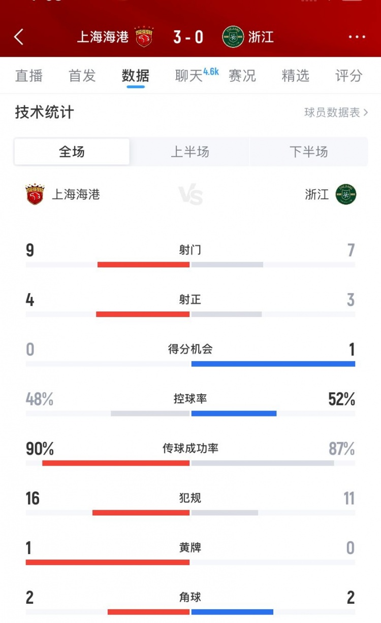 上海海港3-0浙江全场数据:射门9-7、射正4-3、得
