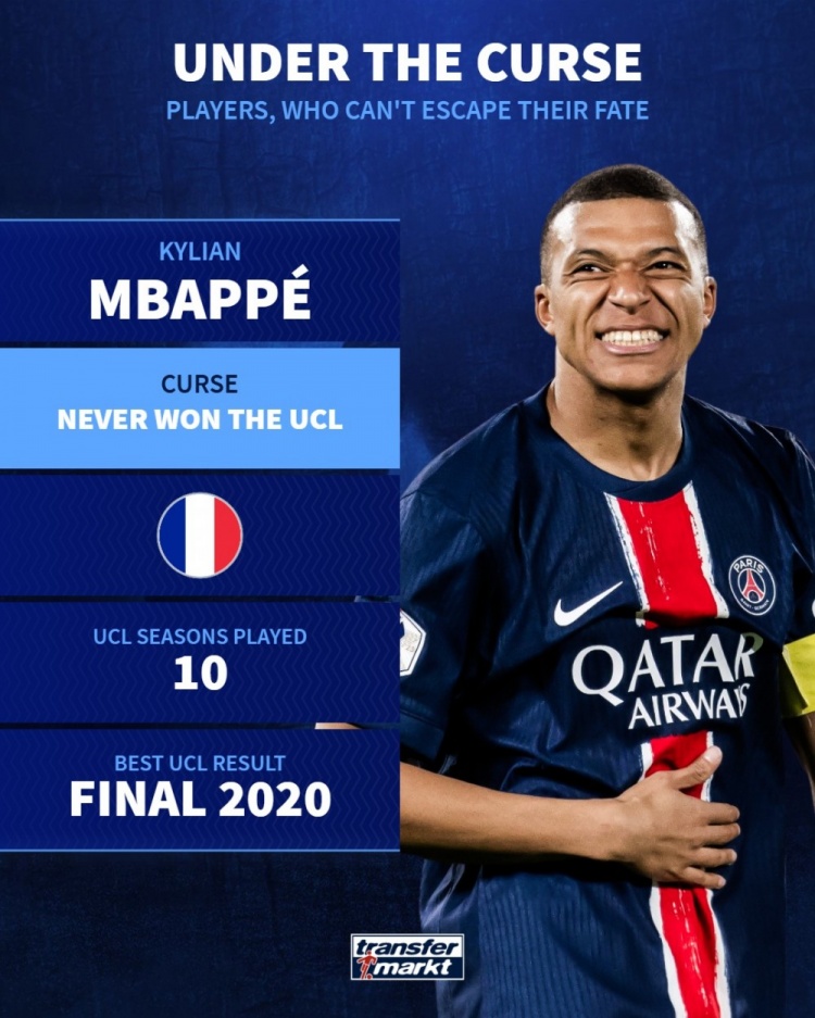 姆巴佩——尚未赢得欧冠 10个赛季参加欧冠 最好成绩2020年亚军