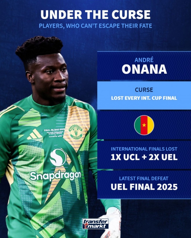 奥纳纳——国际杯赛决赛不胜 1次欧冠决赛、2次欧联杯决赛皆失利 上次决赛失利是2025年欧联杯决赛