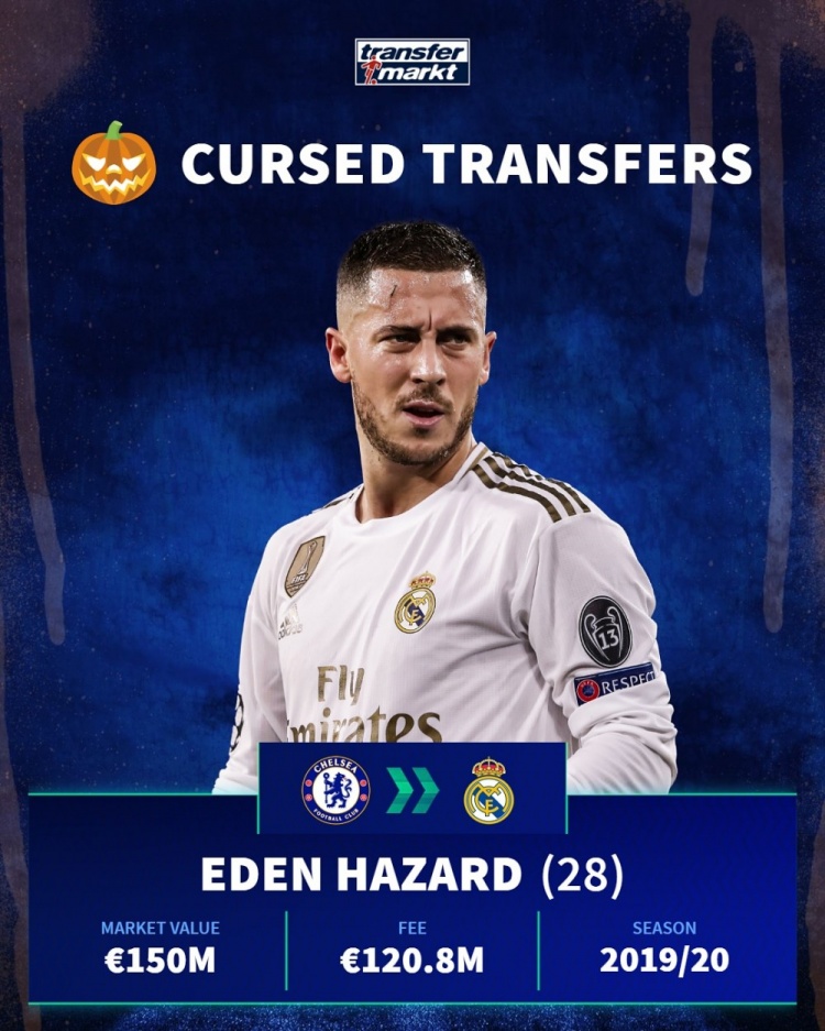 足球比分网11月1日讯 万圣节之际,德国转会市场盘点了“被诅咒的转会”。 德转盘点“被诅咒的转会”: 阿扎尔——切尔西→皇马——1.208亿欧