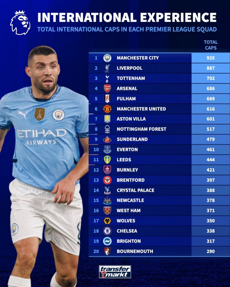 足球比分网11月1日讯 德国转会市场统计了英超各队球员为国家队出战的场次,并列出榜单,曼城925场居首,利物浦887场次席。 英超各队球员为国家队出战场次排名: 曼城——925 利物浦——887 热刺——702 阿森纳——686 富勒姆——669 曼联——616 阿斯顿维拉——601 诺丁汉森林——517 桑德兰——479 埃弗顿——461 利兹联——444 伯恩利——421 布伦特福德——397 水晶宫——388 纽卡——378 西汉姆——371 狼队——350 切尔西——338 布莱顿——317 伯恩茅斯——290