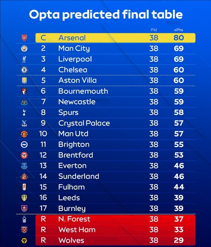 OPTA预测英超最终排名:阿森纳80分夺冠,曼城红