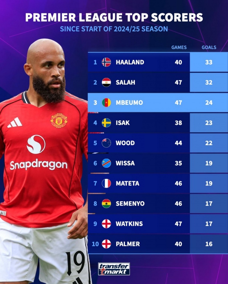 足球比分网10月31日讯 《转会市场》统计了上赛季至今的英超射手榜,哈兰德已经反超萨拉赫居首。 上赛季至今英超射手榜: 1.哈兰德,40场,33球 2.萨拉赫,47场,32球 3.姆伯莫,47场,24球 4.伊萨克,38场,23球 5.伍德,44场,22球 6.维萨,35场,19球 7.马特塔,46场,19球 8.塞梅尼奥,46场,17球 9.沃特金斯,47场,17球 10.帕尔默,40场,16球