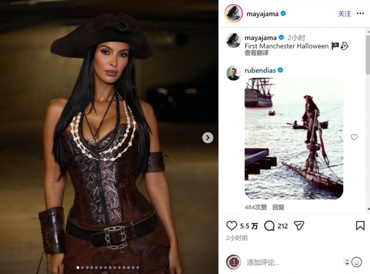 足球比分网11月1日讯 曼城中卫鲁本-迪亚斯的女友玛雅-贾马更新社媒动态,晒出与鲁本-迪亚斯装扮成加勒比海盗的照片。 万圣节之际,鲁本-迪亚斯与女友玛雅-贾马COS加勒比海盗,玛雅-贾马社媒晒出照片,配文:“在曼彻斯特度过的首个万圣节。”