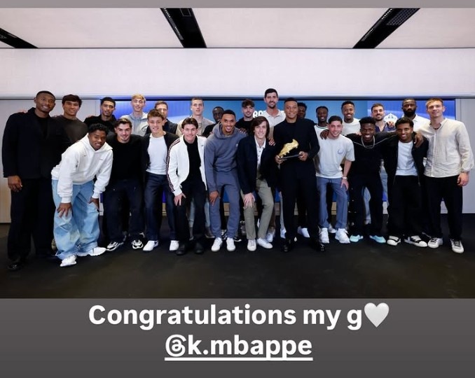 姆巴佩领取欧洲金靴奖!贝林厄姆社媒晒全队合