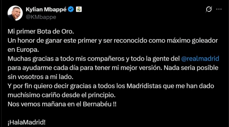 足球比分网10月31日讯 不久前,获得欧洲金靴的皇马前锋姆巴佩更新社交媒体,感谢了队友和球迷的支持。 姆巴佩写道:“我的第一座金靴奖。能够赢得这项荣誉并被评定为欧洲最佳射手,是一种无比的荣耀。” “非常感谢我的所有队友,以及皇家马德里大家庭中每天帮助我不断进步的每一个人。没有你们在我身边,这一切都不可能实现。” “最后,我想向所有从一开始就给予我无尽关爱的马德里球迷们表示感谢。明天伯纳乌见!!¡Hala Madrid!”