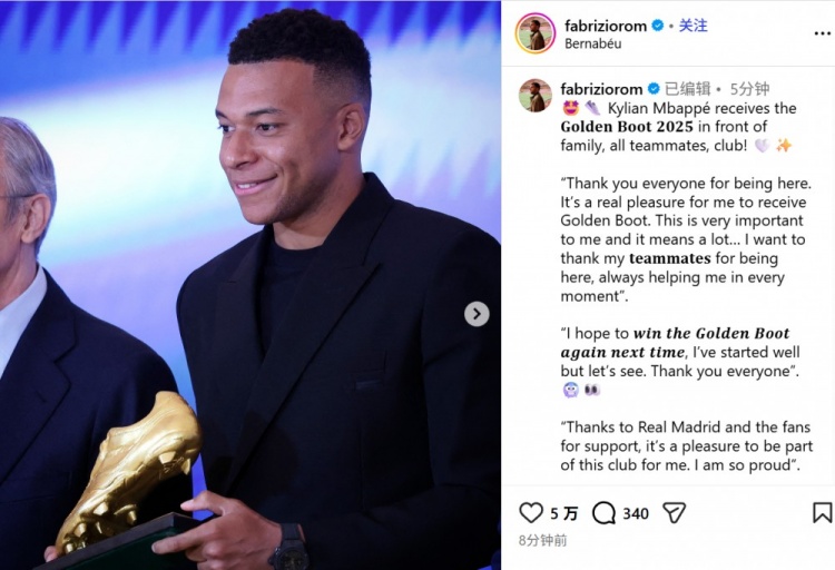 姆巴佩领取欧洲金靴:感谢队友、皇马和球迷,