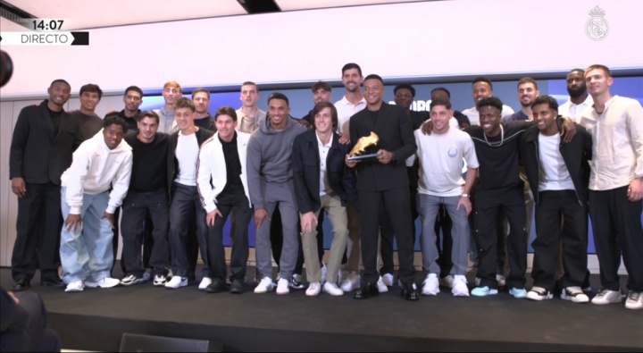 足球比分网10月31日讯 姆巴佩在伯纳乌球场贵宾室领取上赛季的欧洲金靴奖杯。这是姆巴佩生涯首次斩获欧洲金靴,也是乌戈-桑切斯和C罗之后的皇马第三人。 皇马全队也到场支持↓