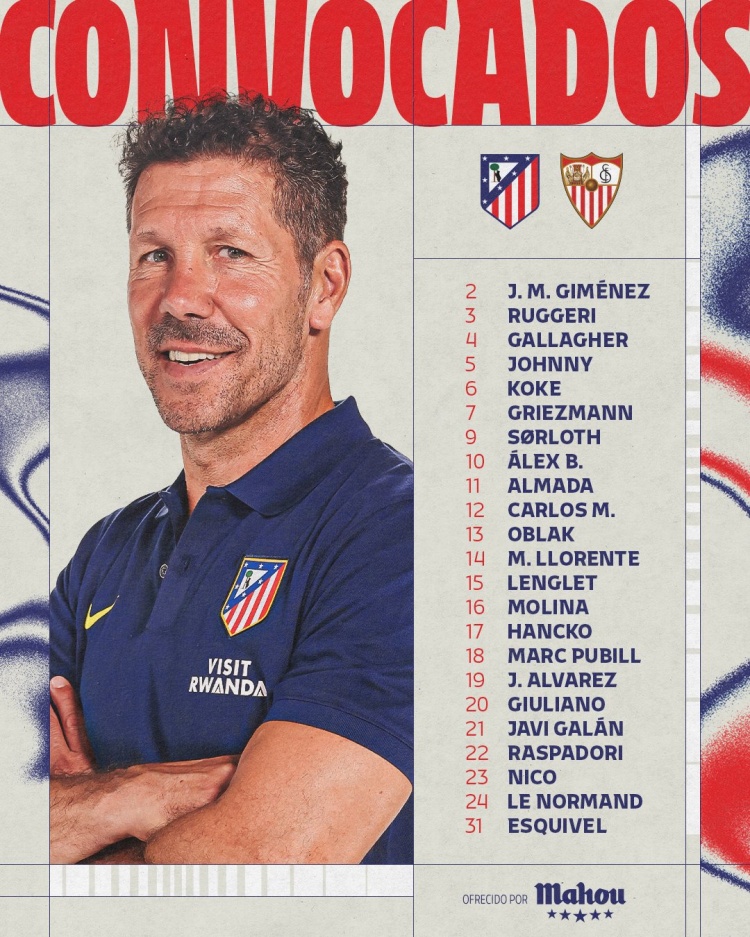马竞主场对阵塞维利亚大名单:格列兹曼领衔,
