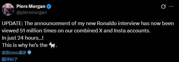 足球比分网10月31日讯 知名主持人皮尔斯-摩根在社媒预告了下周将发布C罗专访,同时表示这是C罗一生中最私密、最坦诚的采访。 今天,摩根再次更新社媒,表示在昨天发布的预告动态已经有了5100万次的点击。摩根表示:我对C罗的最新专访预热在我们的X和Instagram账号上累计获得5100万次观看。短短24小时内达成!这就是为什么他是goat。