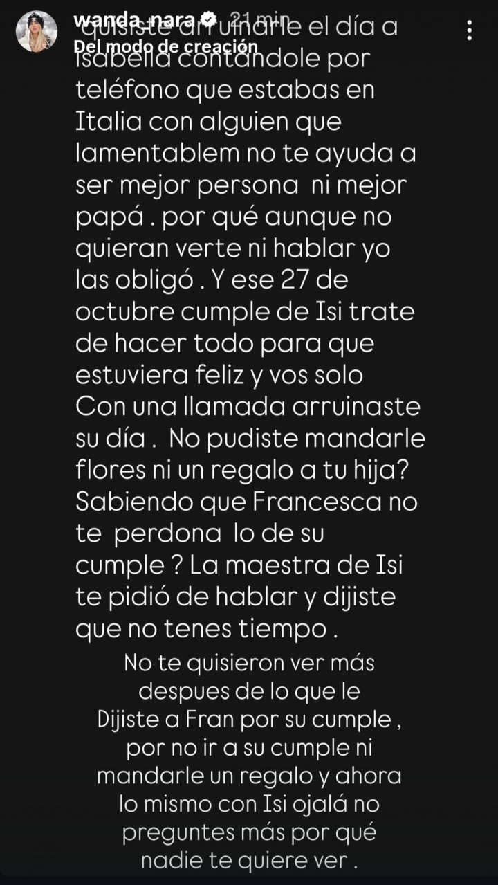 旺达:你想通过电话告诉伊莎贝拉你很遗憾在意大利和一个不能让你成为更好的人、也不能让你成为更好爸爸的人在一起,以此毁掉她的一天。尽管她们不想见你、不想和你说话,我还是强迫她们(和你联系)。10 月27日伊西的生日,我尽力让她开心,而你只打了一个电话就毁了她的一天。你就不能给你女儿送束花或一份礼物吗?你明知弗朗西斯卡还没原谅你没参加她的生日、没送她礼物,现在对伊西又故技重施。但愿你别再问为什么没人想见你了。 |