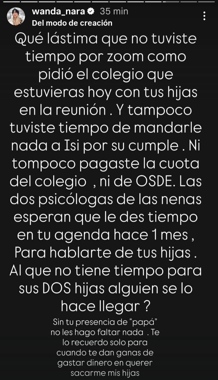 足球比分网11月01日讯 伊卡尔迪前妻旺达·娜拉连续更新两条社媒社媒,批评伊卡尔迪对待孩子的行为。 旺达:真可惜,你没能按学校要求参加今天的线上家长会,和女儿们一起通过Zoom(视频会议软件)参会。你也没时间给伊西送任何生日礼物。学校的费用、医疗保险的费用你也都没交。女儿们的两位心理医生一个月前就希望你能在日程中留出时间,和她们聊聊你的女儿们。对自己的两个女儿都没时间的人,需要有人提醒他吗?没有你这个‘爸爸’的存在,我也不会让她们缺任何东西。我提醒你,这只是为了防止你哪天想花钱把我的女儿们从我身边夺走。