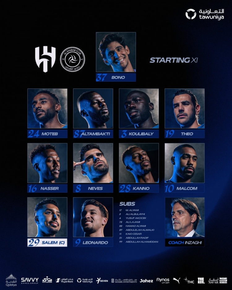 利雅得新月vs利雅得青年人首发:内维斯、特奥、