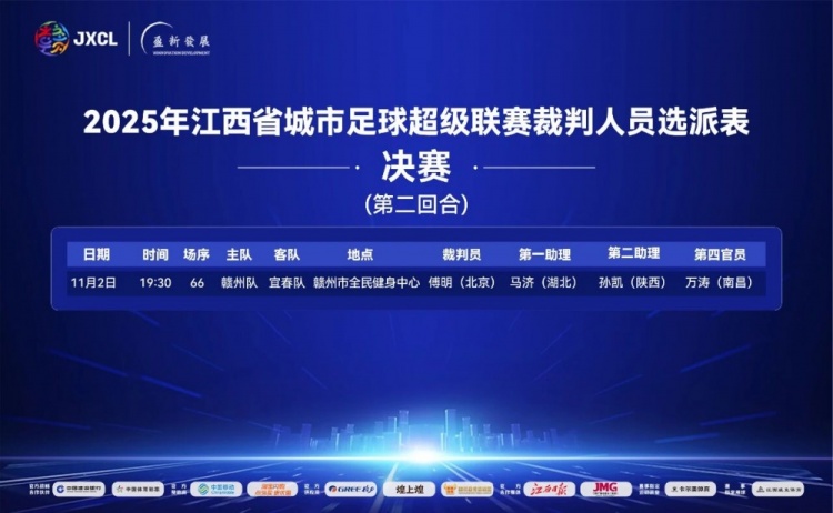 足球比分网11月2日讯 2025年江西省城市足球超级联赛(简称“赣超”)决赛次回合,宜春队vs赣州队的比赛将于今晚19:30在赣州市全民体育中心打响,首回合赣州队客场2-0取胜,取得先机。 今日赣超官方宣布了本场比赛的裁判选派,国际级裁判、名哨傅明执法。具体如下: 主裁判:傅明 第一助理裁判:马济 第二助理裁判:孙凯 第四官员:万涛 |