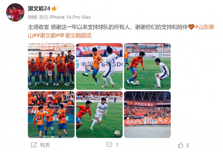 足球比分网11月1日讯 泰山队球员谢文能更新社媒,感谢球迷的支持。 中超第29轮,泰山队主场2-1战胜津门虎,这也是泰山队赛季主场收官战。赛后,谢文能更新社媒纪念,他写道:主场收官 感谢这一年以来支持球队的所有人,谢谢你们的支持和陪伴。 本赛季,24岁谢文能代表山东泰山出战28场中超联赛,贡献4球8助攻。 |