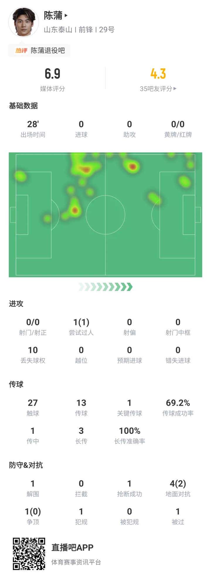 足球比分网11月01日讯 中超第28轮,山东泰山2-1击败天津津门虎,赛后替补登场的陈蒲表现遭到球迷吐槽。 下半场补时第3分钟,陈蒲边路获得良机,在准备停球时却直接摔倒。 陈蒲数据↓