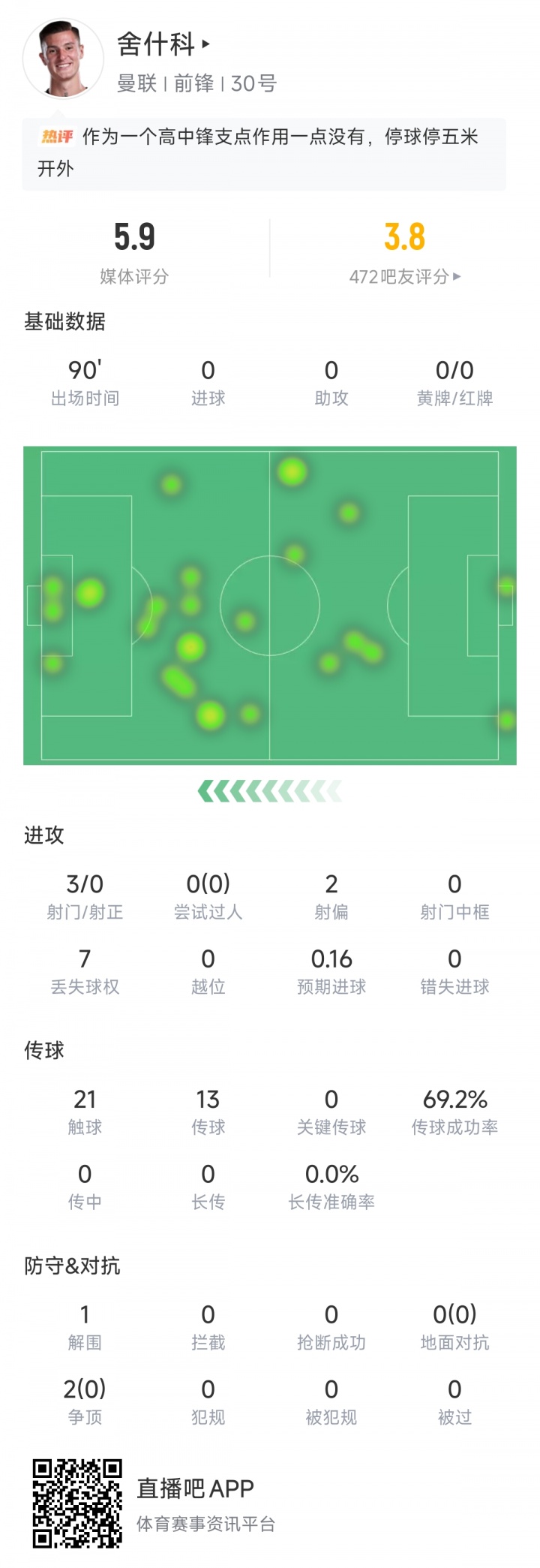 足球比分网11月02日讯 英超第10轮,曼联2-2战平保级区的森林,无缘四连胜。 本场比赛22岁的舍什科打满全场,表现不佳,评分仅5.9分,低于6分的基础分。他的全场数据如下:3射0正0对抗,争顶0成功,21次触球7次丢球权,传球成功率69.2%。 舍什科本赛季一共为曼联出战11场比赛,目前暂2球1助,他的身价高达7000万欧。 具体数据: