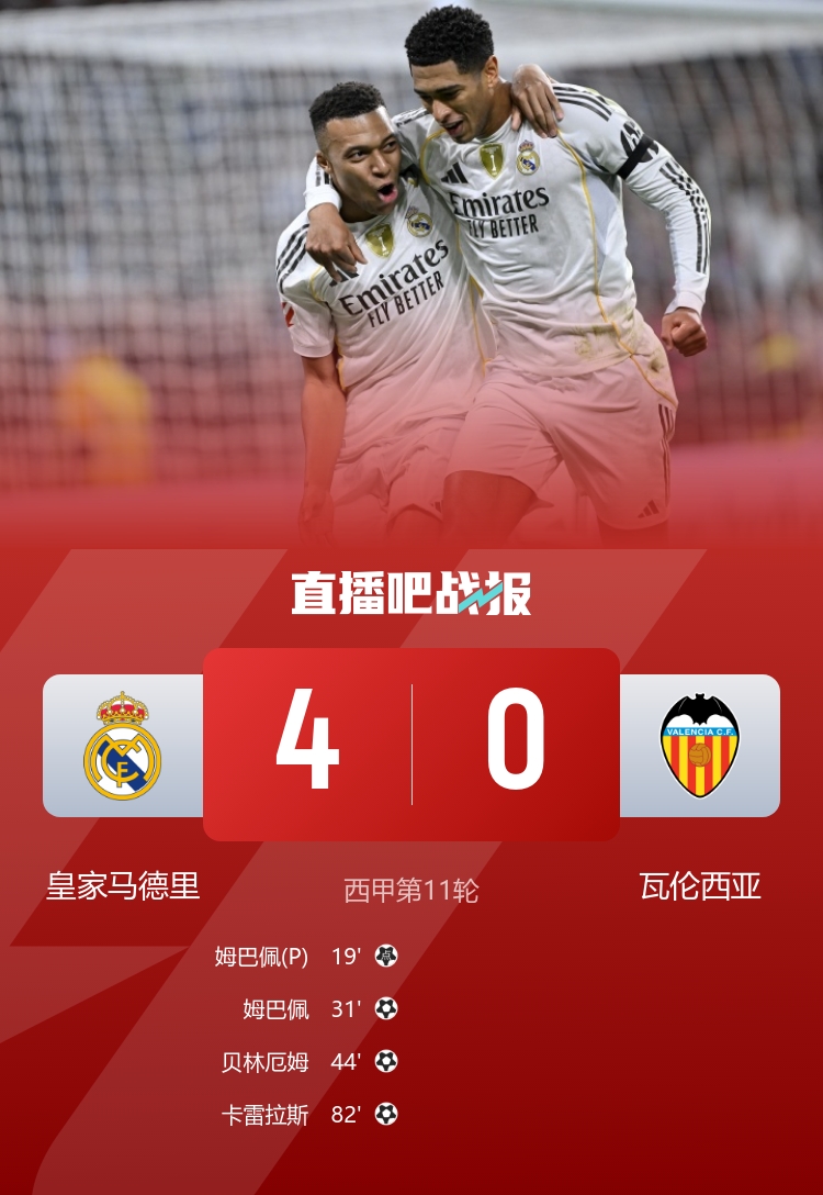 姆巴佩双响,A费世界波打进个人皇马生涯首球。最终皇马4-0瓦伦西亚,各项赛事六连胜,7分领跑积分榜。 西甲积分榜:皇马11轮10胜暂7分优势领跑,巴萨第三明日出战 豪取15连胜!拜仁3-0勒沃库森5分领跑 格纳布里破门杰克逊建功 轻松领跑!德甲积分榜:拜仁开季9轮全胜,以5分优势领跑