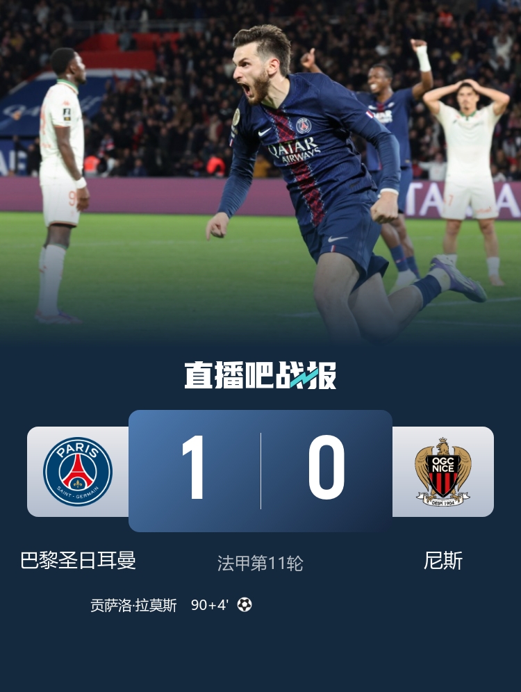阿尔瓦雷斯点球命中,阿尔马达破门,格列兹曼建功。最终马德里竞技3-0击败塞维利亚。 法甲-巴黎1-0尼斯先赛4分领跑 贡萨洛-拉莫斯补时读秒绝杀