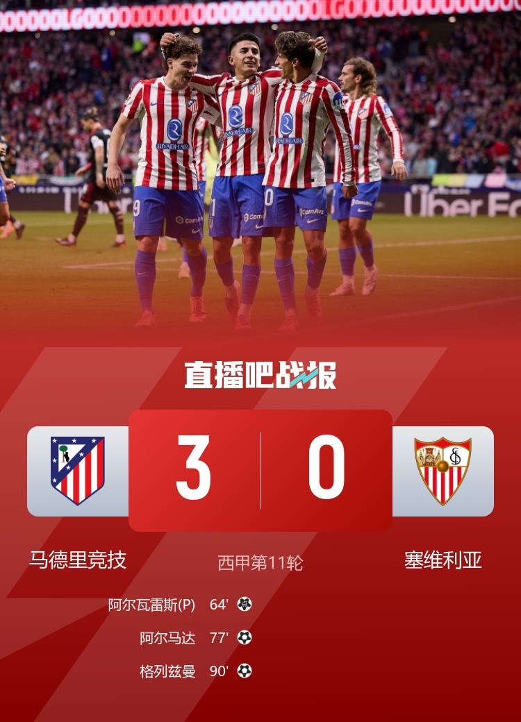 科斯蒂奇闪击破门,坎比亚索建功,瓦尔迪扳回一城。最终尤文2-1击败克雷莫内塞,新帅斯帕莱蒂执教尤文首秀告捷。 西甲-马竞3-0塞维利亚联赛十轮不败 阿尔瓦雷斯点射格列兹曼破门