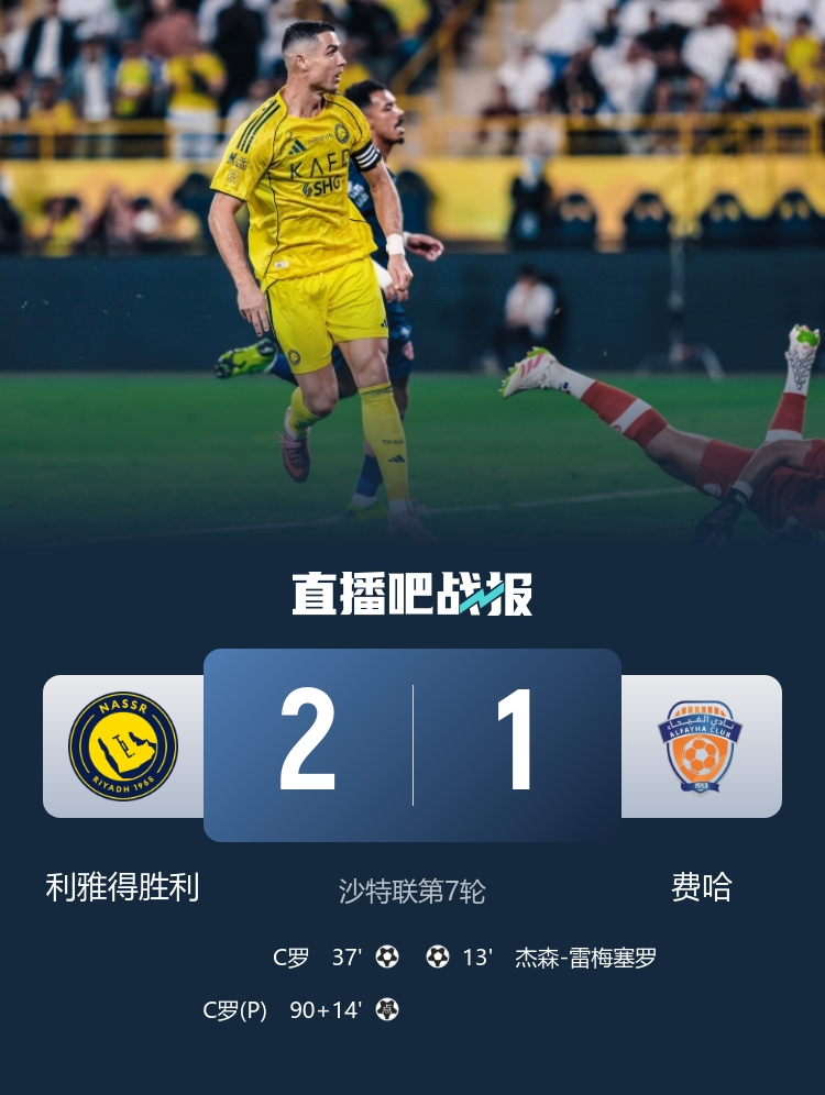 C罗双响、生涯已进952球,利雅得胜利主场2-1逆转费哈,胜利联赛开局豪取7连胜。 斯帅首秀获胜!尤文2-1克雷莫内塞 科斯蒂奇闪击坎比亚索破门