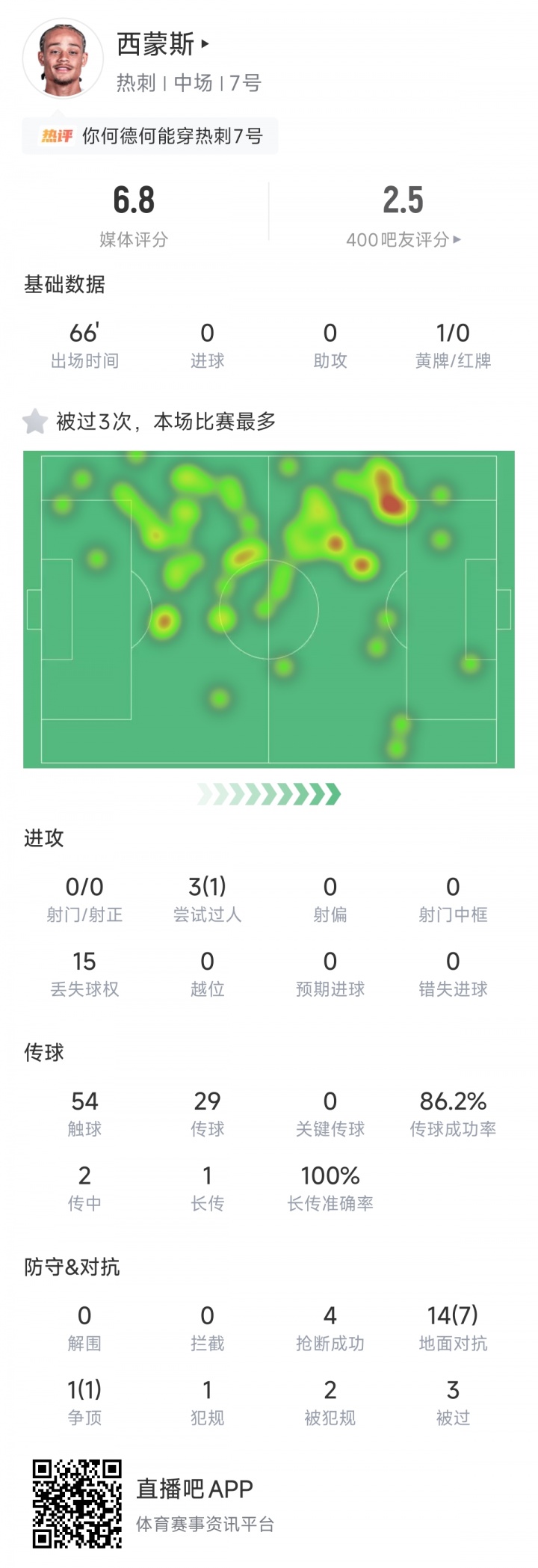 足球比分网11月02日讯 英超第10轮,热刺主场0-1不敌切尔西,哈维-西蒙斯本场比赛出战66分钟。 22岁的西蒙斯昨晚第7分钟替补登场,换下脑震荡的贝里瓦尔。但是他出战66分钟表现不佳,被过3次+15次丢球权,传球成功率86.2%。在第73分钟他被换下。 哈维-西蒙斯今夏以6500万欧的转会费加盟热刺,从德转数据来看,他的转会费是热刺队史最高的花费,也即是引援标王。但是加盟热刺至今,西蒙斯12场仅贡献1助,还未取得进球。上赛季西蒙斯在莱比锡33场贡献11球8助。