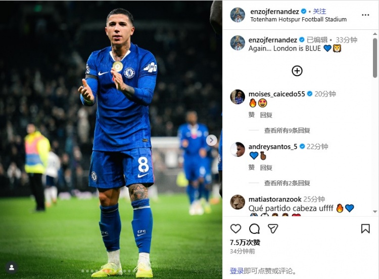 足球比分网11月2日讯 2025-26赛季英超第10轮焦点战,切尔西1-0击败热刺。赛后,蓝军中场恩佐在社交媒体晒图,庆祝球队获胜。 恩佐上传了自己在比赛中的照片,并配文写道:“再一次……伦敦是蓝色的 |