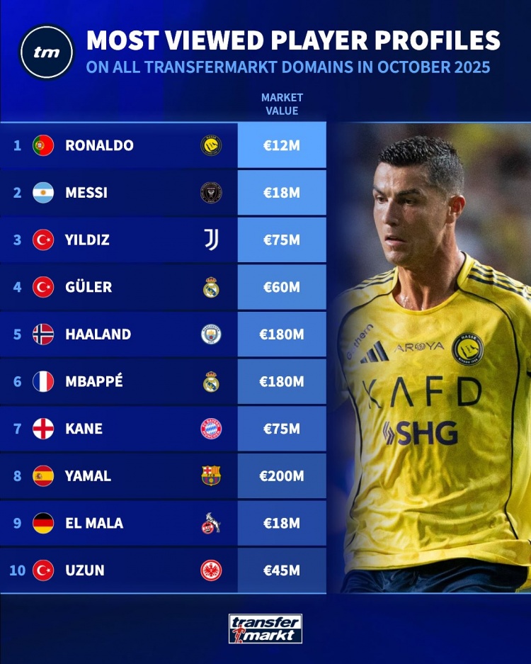 10月德转球员页面浏览量排名:C罗居首,梅西、