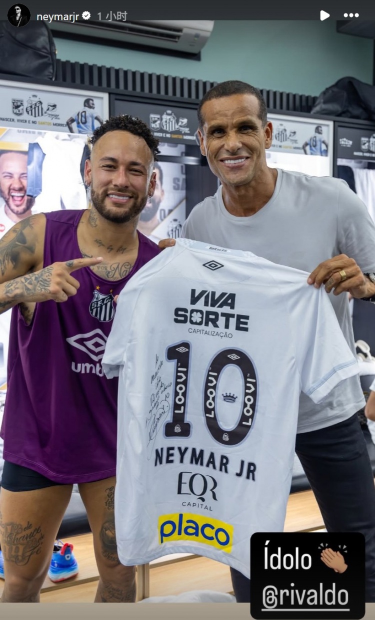 足球比分网11月2日讯 在本轮巴甲,桑托斯1-1战平福塔雷萨。 本场比赛内马尔替补登场迎来复出,赛后内马尔也在社媒晒出与巴西名宿里瓦尔多的合影,并赠送签名球衣,配文写道:“偶像里瓦尔多!” |