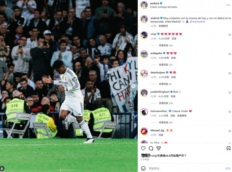 足球比分网11月2日讯 在本轮西甲,皇马4-0大胜瓦伦西亚。 本场比赛恩德里克在尾声阶段替补登场,迎来本赛季首次登场,赛后恩德里克社媒发文写道:“非常高兴能够赢得今天的比赛并完成我在本赛季的首次亮相,皇马加油!”