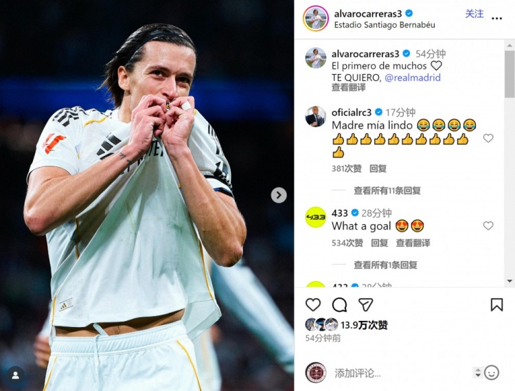 足球比分网11月2日讯 西甲第11轮比赛,卡雷拉斯世界波破门,斩获皇马生涯首球,帮助皇马主场4-0击败瓦伦西亚。 卡雷拉斯社媒晒出亲吻皇马队徽的照片,配文:“很多进球中的第一个。我爱你,皇马。”